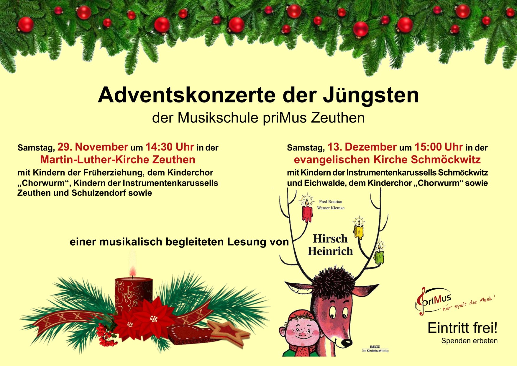 Am 29. November um 14:30 Uhr treten unsere Jüngsten in der Martin-Luther-Kirche (Schillerstraße 2) auf - Kinder aus zwei Kursen der Früherziehung sowie Kinder aus den Kursen Instrumentenkarussell in Zeuthen und Schulzendorf. Ergänzt wird das Programm mit einer musikalisch begleiteten Lesung der Geschichte Hirsch Heinrich